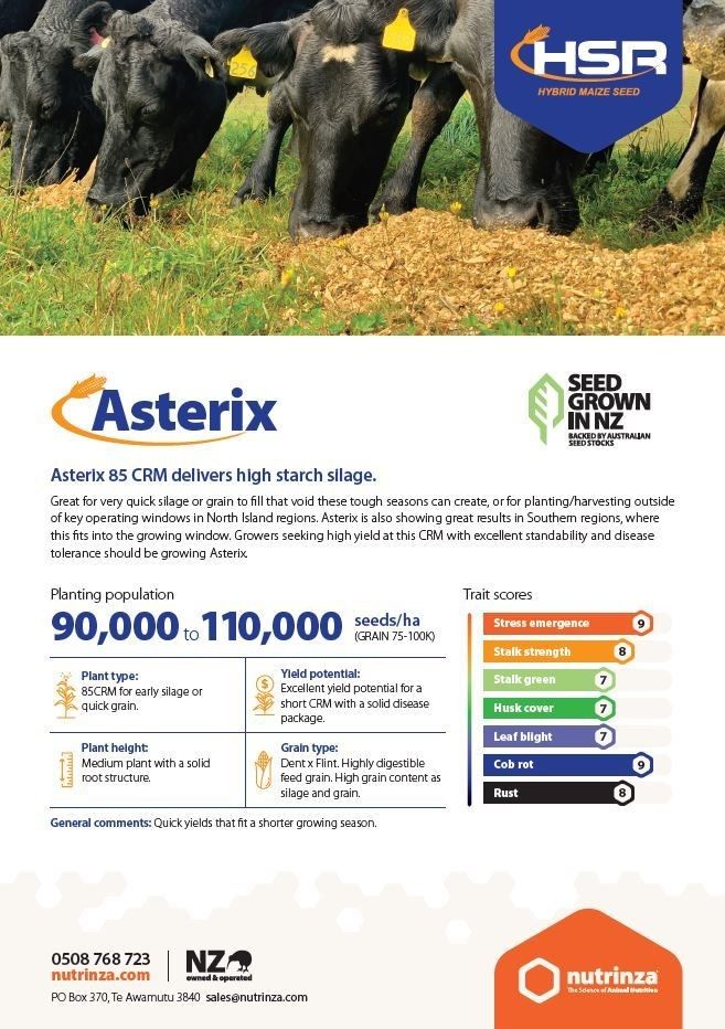 Great for very quick silage or grain to fill that void these tough seasons can create, or for planting/harvesting outside of key operating windows in North Island regions. Showing great results in Southern regions where this fits into the growing window. Growers seeking high yield at this CRM with excellent standability and disease tolerance should be growing Asterix.