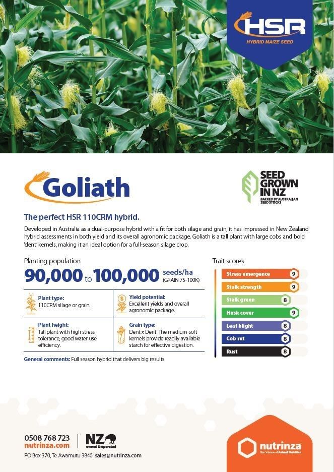 Goliath is the perfect HSR 110CRM hybrid for Spring. Developed in Australia as a dual-purpose hybrid with a fit for both silage and grain, it has impressed in New Zealand hybrid assessments in both yield and its' overall agronomic package. Goliath is a tall plant with large cobs and bold 'dent' kernels making it an ideal option for a full-season silage crop.