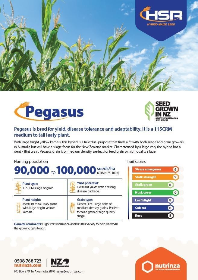Pegasus is bred for yield, disease tolerance and adaptability. HSR’s 115CRM medium to tall leafy plant. With large bright yellow kernels, this hybrid is a true ‘dual purpose’ that finds a fit with both silage and grain growers in Australia but will have a silage focus for the New Zealand market. Pegasus is characterised by a large cob, the dent x flint grain this hybrid is of medium density, perfect for feed grain or high-quality silage.