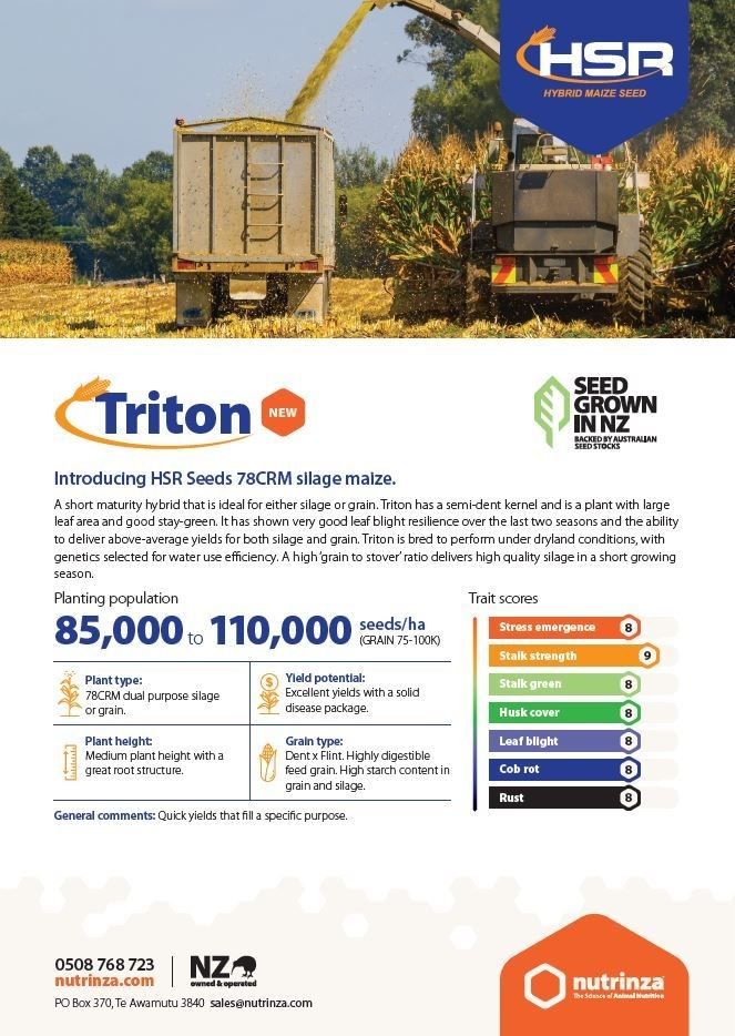 A short maturity hybrid that is ideal for either silage or grain. Triton has a semi-dent kernel and a plant with large leaf area and good stay-green. It has shown very good leaf blight resilience over the last two seasons and the ability to deliver above-average yields for both silage and grain. Triton is bred to perform under ‘dryland’ conditions, with genetics selected for water-use efficiency (WUE). A high ‘grain to stover’ ratio delivers high quality silage in a short growing season.